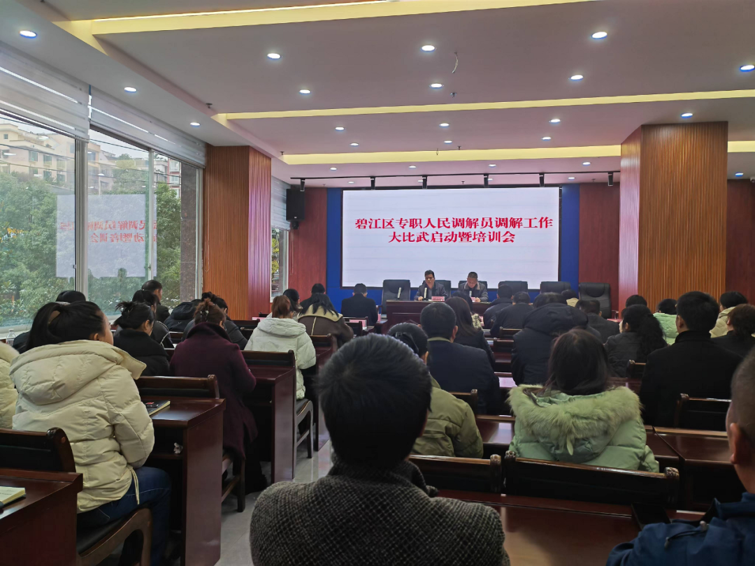 为进一步提升碧江区专职人民调解员的政治素质、业务水平和调解能力,激发工作热情和创造力,推动全区人民调解工作再上新台阶,提高群众对人民调解工作的满意度。1月17日,碧江区司法局在社区矫正中心召开了“碧江区专职人民调解员调解工作大比武启动暨培训会”,正式拉开专职人民调解员调解工作大比武活动的序幕。该区司法局党组书记、局长杨群刚出席会议并作启动讲话,全区15个司法所负责人、局人民参与和促进法治股全体工作人员、城区7个街道专职人民调解员等共计70余人参加此次会议。